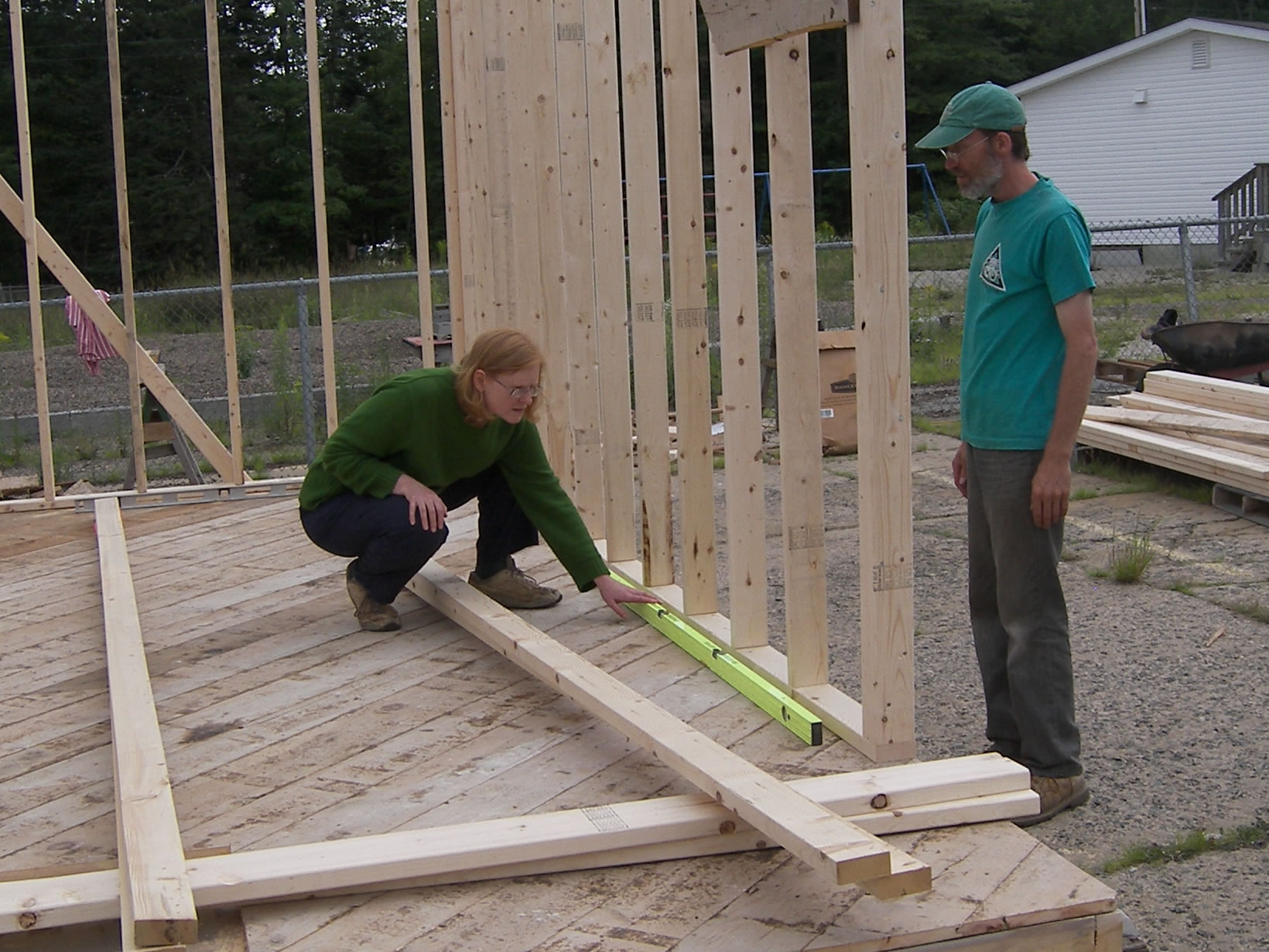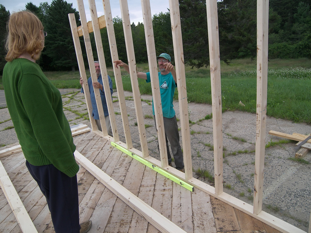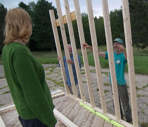 Tiny Studio – Framing the walls The Blockhouse School Project Posted on August 2, 2013 by Heather HolmAugust 18, 2013 Today the Tiny Studio crew was framing the walls. Lloyd with the studio-in-progress Lloyd points out where the windows will go. Lots of windows. Pam checks the level Consulting the plans