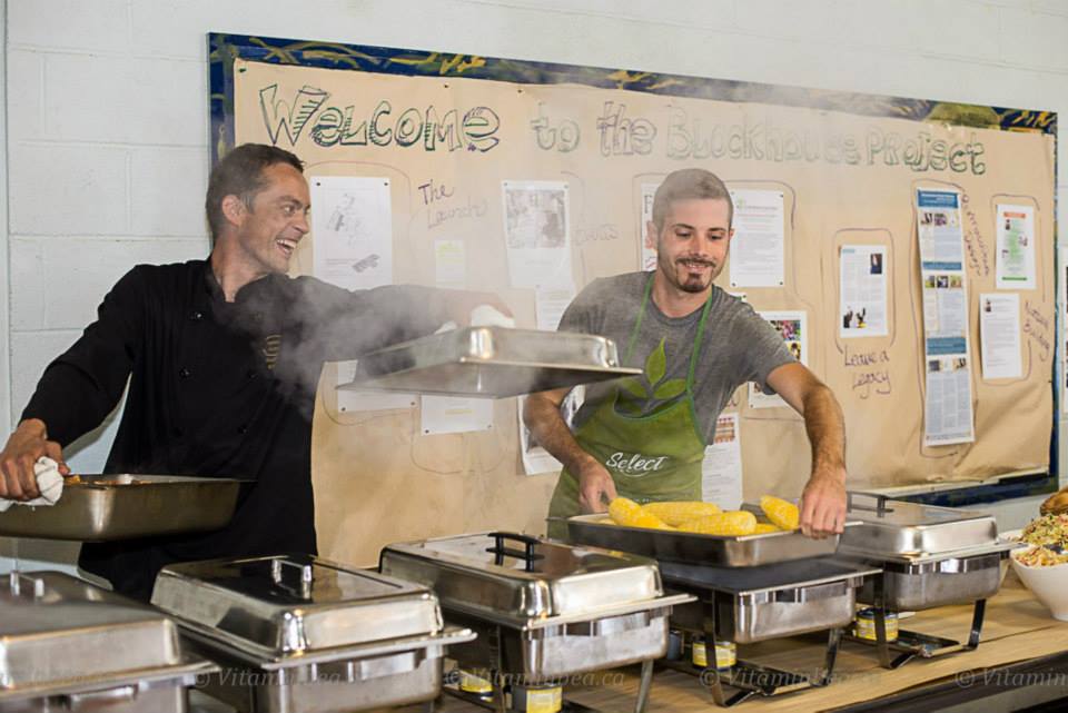 Chefs Matthew Krizan and Peter Hardy serve up local deliciousness in the gym at our IncrEdible Picnic, Sept. 2013. B. Schuler photo.